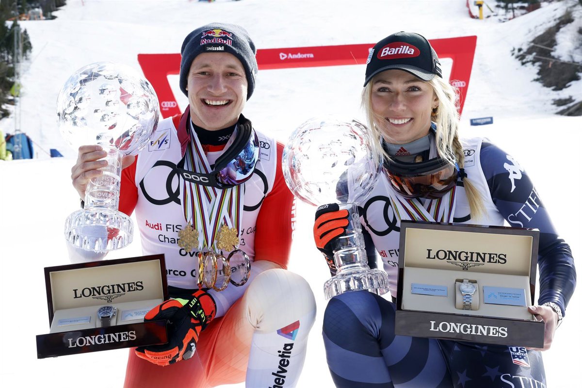 Los embajadores de Longines Marco Odermatt y Mikaela Shiffrin, grandes triunfadores de la temporada 2022-23 de la Copa del Mundo de esquí alpino. - LONGINES