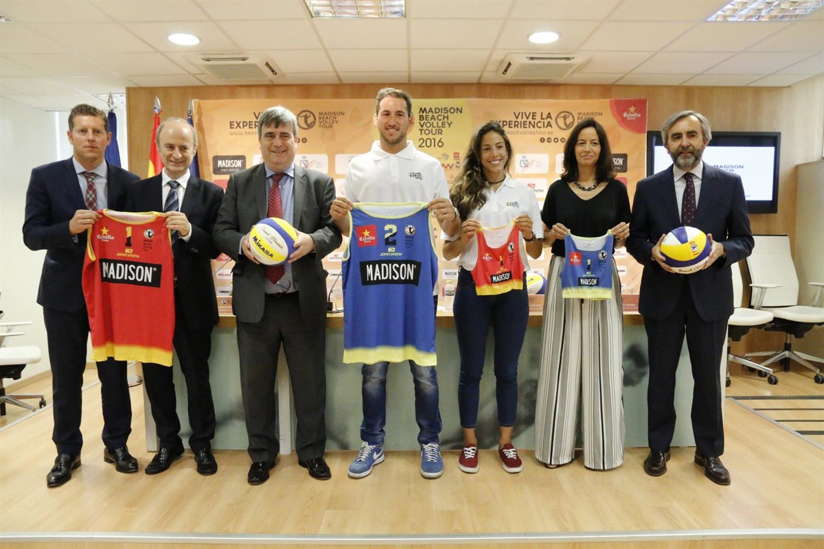 El presidente en funciones del Consejo Superior de Deportes (CSD), Miguel Cardenal, y su homólofo de la Federación Española de Voleibol, Agustín Martín Santos, presentaron las principales novedades del circuito Madison Volley Tour 2016, el campeonato de España de Voley Playa, que volverá a contar con una sede en Madrid y que se desplazará a Valencia, Laredo, Tarragona y Fuengirola, donde se disputará la final, durante los meses de verano.