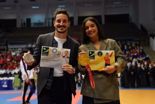 María Torres posa con su medalla de oro del Mundial de Dubai junto a Damián Quintero y su plata en un homenaje en Málaga - RFEK Y DA