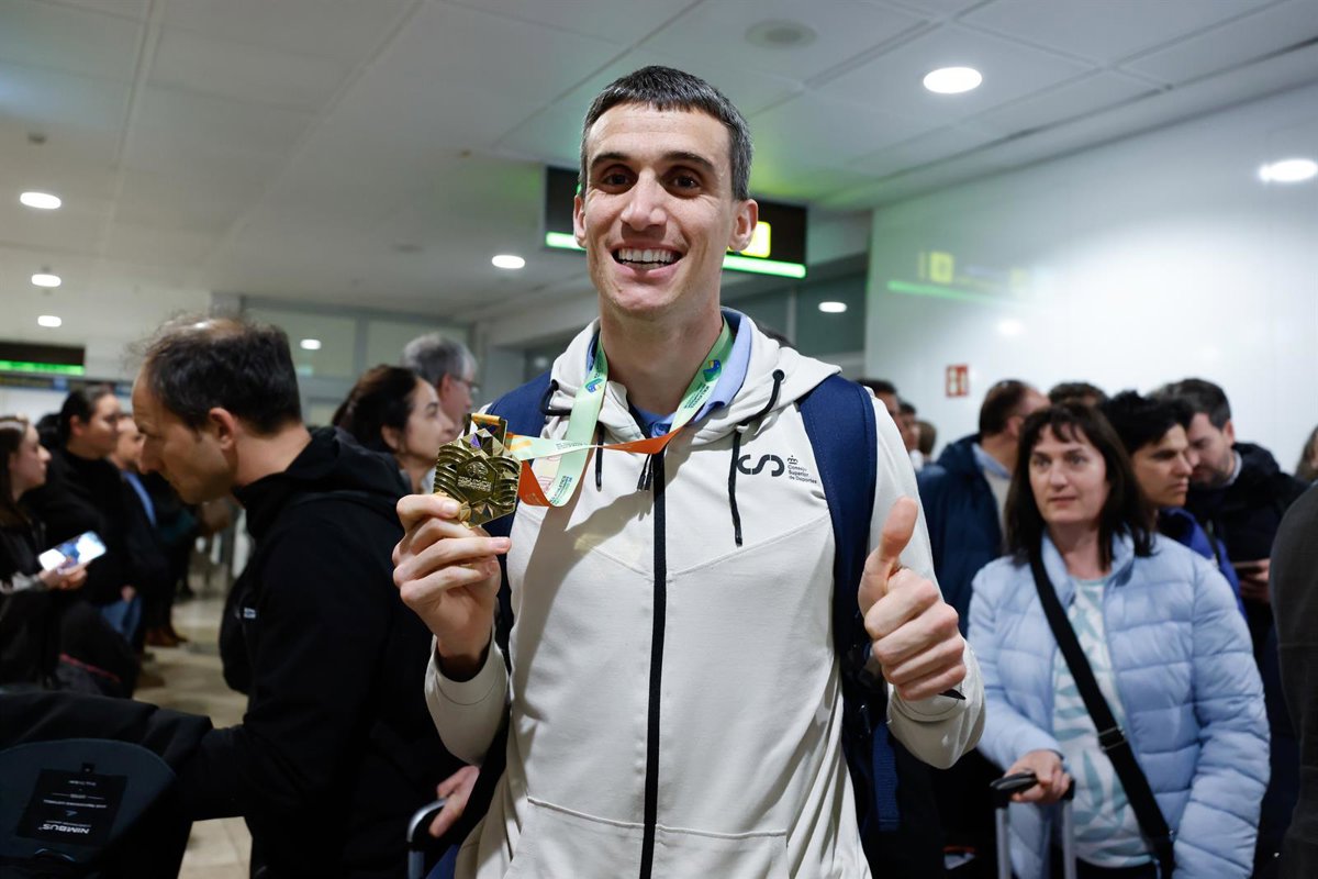 Mariano García posa con su medalla de oro del Campeonato del Mundo de pista cubierta de Torun a su llegada al aeropuerto Adolfo Suárez Madrid–Barajas - Dennis Agyeman / AFP7 / Europa Press