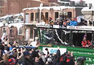 Los jugadores, el entrenador, sus familiares y amigos recorrieron las calles desde la Torre Prudential hasta la Plaza del Ayuntamiento montados en 25 vehículos blindados de la Segunda Guerra Mundial, conocidos como 'duck boats', que son la tradición en los desfiles deportivos de Boston.