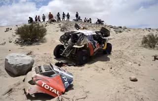 El bicampeón del mundo de rallys, que ya por entonces perdía muchos tiempo con Peterhansel en la especial, llegó a la meta seis horas después remolcado por un camión de asistencia y tras ver los daños, el equipo decidió el abandono del español, el quinto en sus participaciones en el 'raid' y el cuarto consecutivo.