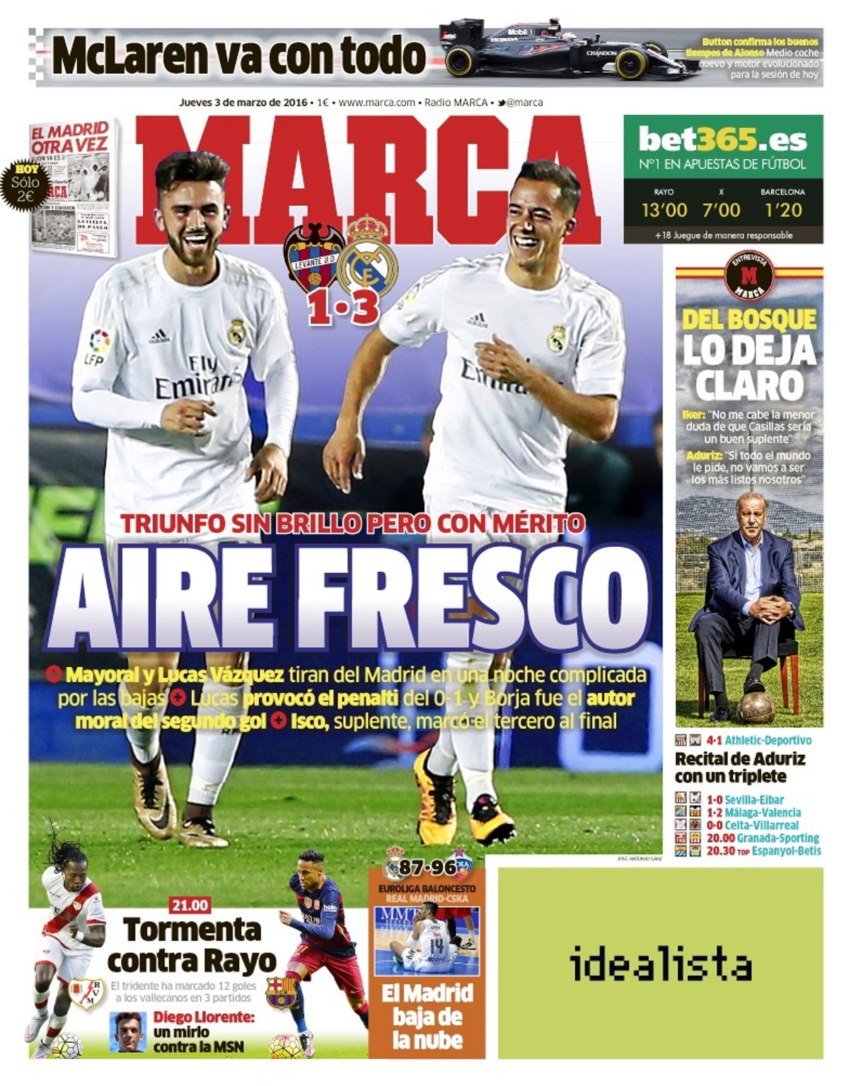 FÚTBOL Real Madrid-Levante “Aire Fresco. Triunfo sin brillo pero con mérito.Mayoral y Lucas Vázquez tiran del Madrid en una noche complicada por las bajas.Lucas provocó el penalti del 0-1 y Borja fue el autor moral del segundo. Isco, suplente, marcó el tercero al final.”; Rayo-Barcelona “Tormenta contra Rayo. El tridente ha marcado 12 goles a los vallecanos en 3 partidos”; Del Bosque “Del Bosque lo deja claro. Iker podría ser un buen suplente.”