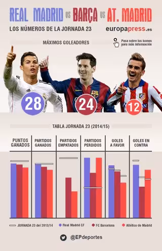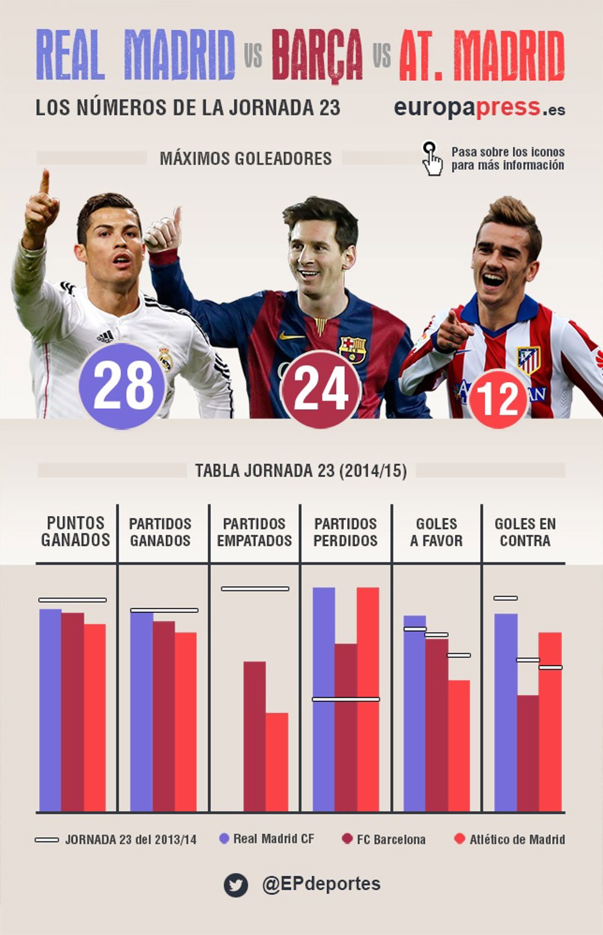En la jornada 23 de La Liga BBVA, la clasificación en la tabla por los primeros puestos está muy disputada. El Real Madrid, el Fútbol Club Barcelona y el Atlético de Madrid encabezan la lista con pocos puntos de diferencia entre el primero y el segundo, lo que hace difícil predecir quién acabará coronándose como campeón de Liga al final de temporada.