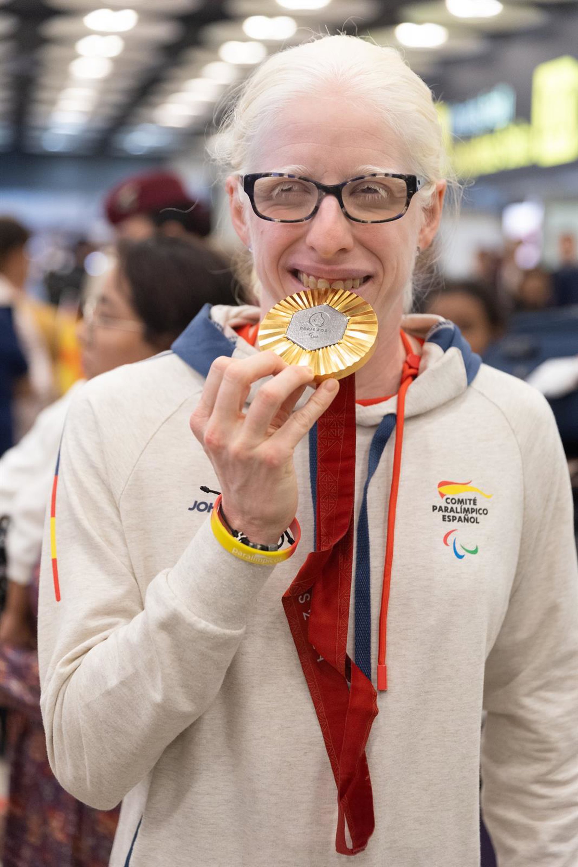 Archivo - La triatleta Susana Rodríguez sujeta su oro paralímpico en los Juegos de Paris 2024 en el Aeropuerto Adolfo Suárez Madrid-Barajas. - Eduardo Parra - Europa Press - Archivo