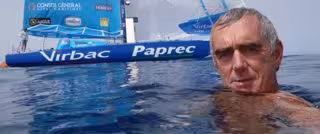 A punto de llegar a Barcelona, Loïck Peyron ha aprovechado la calma de esta tarde para darse un chapuzón. En una acción insólita, el bretón envió una fotografía a la organización con el objetivo de mostrar la falta absoluta de viento.