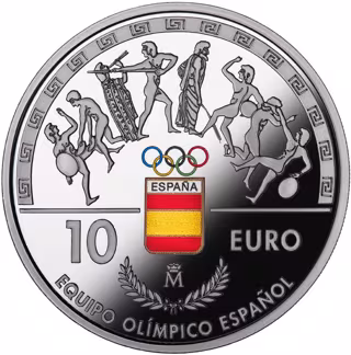 Por otro lado, la de diez euros, en el anverso muestra la efigie de Su Majestad el rey Don Felipe VI y en el reverso, una escena con varios atletas griegos ejecutando distintas modalidades deportivas, por encima una greca y el escudo del COE a color en el centro.
