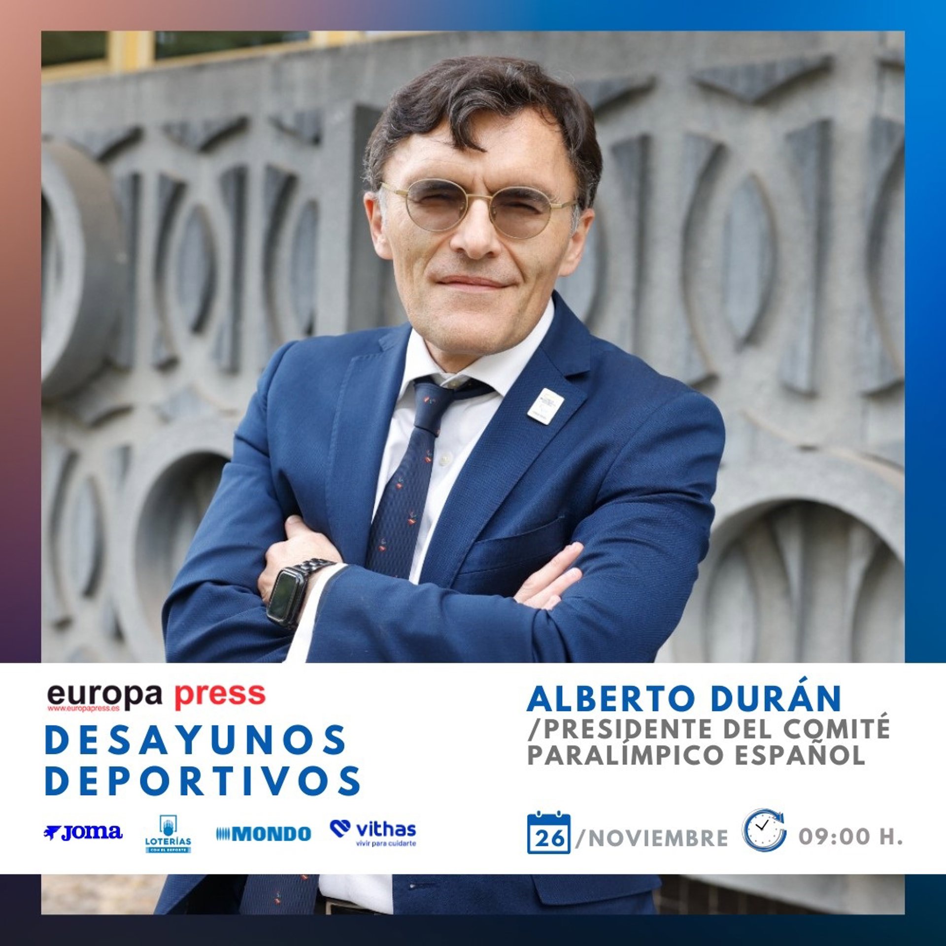 El nuevo presidente del Comité Paralímpico Español (CPE), Alberto Durán, compartirá este martes (9:00 horas) los retos que afronta en el cargo, al que accedió hace un mes en sustitución de Miguel Carballeda, en el nuevo ciclo hacia los Juegos Paralímpicos de Los Ángeles 2028 en los Desayunos Deportivos de Europa Press.