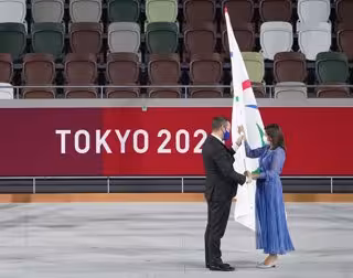 Andrew Parsons entrega la bandera del Comité Paralímpico Internacional a Anne Hidalgo, alcaldesa de París, durante la Ceremonia de Clausura de Tokyo 2020 - Marcus Brandt/dpa