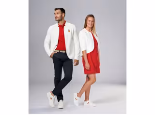Los deportistas masculinos, liderados por Saúl Craviotto, vestirán chaqueta blanca, con corte clásico y cuello mao, combinada con polo en tejido pique de algodón, también con cuello mao. El pantalón está diseñado con corte chino ajustado con bolsillos clásicos.
