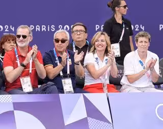La presidenta de la FEB, Elisa Aguilar, junto al rey Felipe VI, el presidente del COE, Alejandro Blanco, y la ministra de Deportes, Pilar Alegría, en las semifinales del torneo 3x3 femenino en los Juegos Olímpicos de Paris 2024. - COE