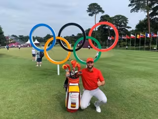 El golfista español Adri Arnaus posa con los aros olímpicos antes de iniciar la competición en los Juegos de Tokyo 2020. - RFEGOLF