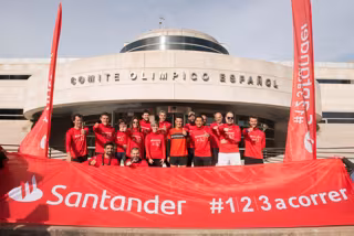 El triatleta Javier Gómez Noya, en la sede del COE junto a corredores de la prensa especializada - BANCO SANTANDER