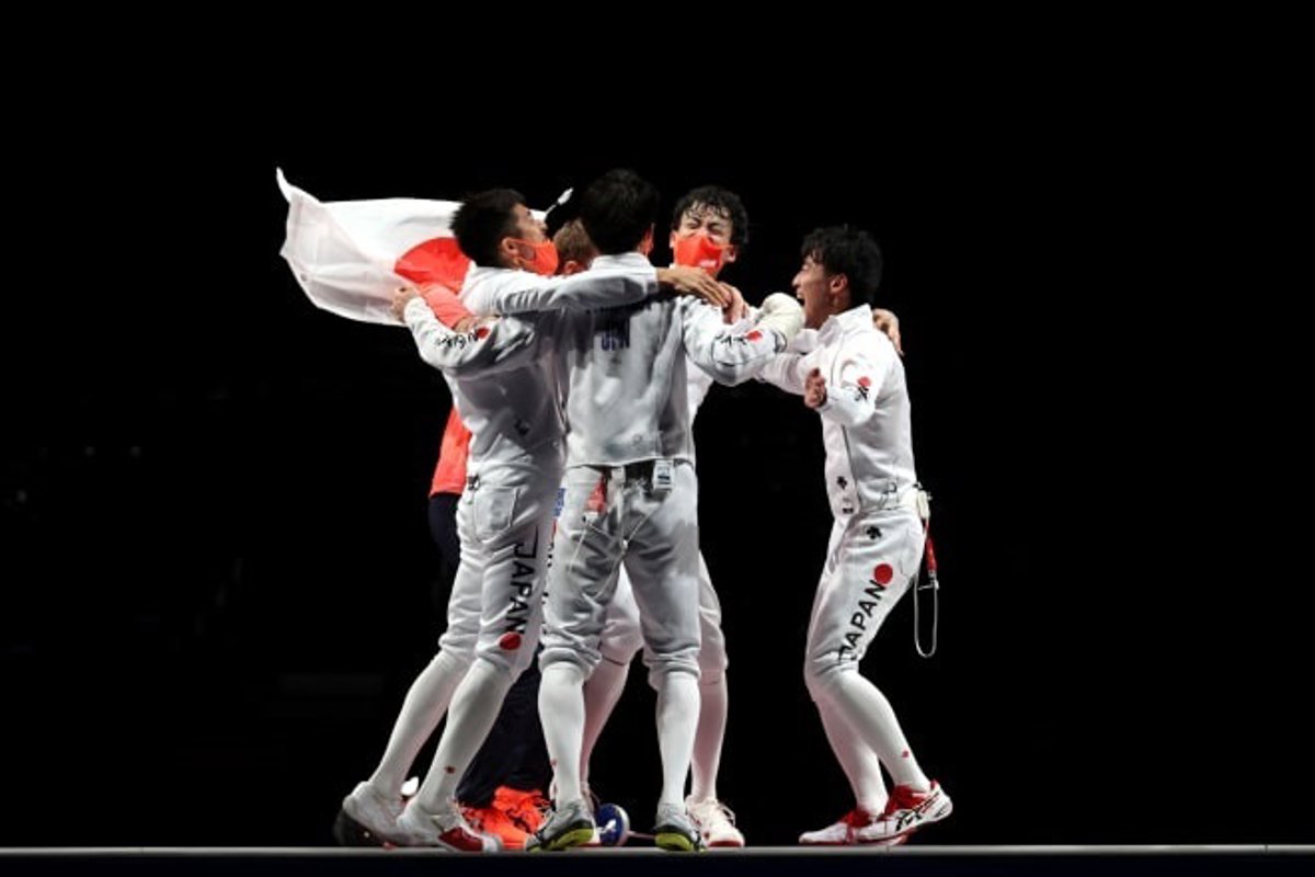 Japón, el equipo anfitrión, ganó su primera medalla de oro olímpica en esgrima al ganar la categoría de espada por equipos al equipo ruso por un buen 45-36, ganando seis de los nueve combates.