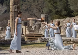 Celebrada en la cuna de los antiguos Juegos de Grecia, Olimpia, la antorcha fue encendida en el ancestral templo de Hera por el método tradicional mediante los rayos de sol, usando un espejo parabólico para comenzar el relevo local.
