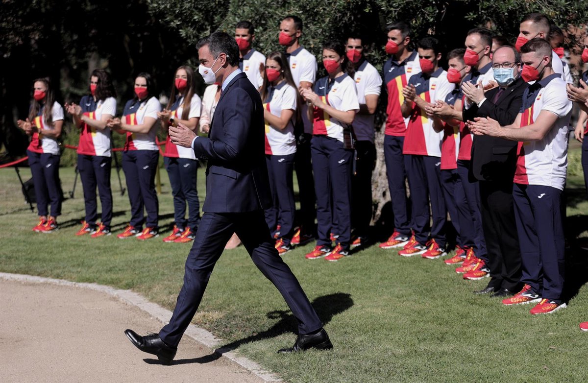 El presidente del Gobierno, Pedro Sánchez y el ministro de Cultura y Deporte, Miquel Iceta, durante la recepción al equipo olímpico español que participará en los Juegos Olímpicos de Tokio 2021, en los Jardines del Palacio de La Moncloa - Eduardo Parra - Europa Press