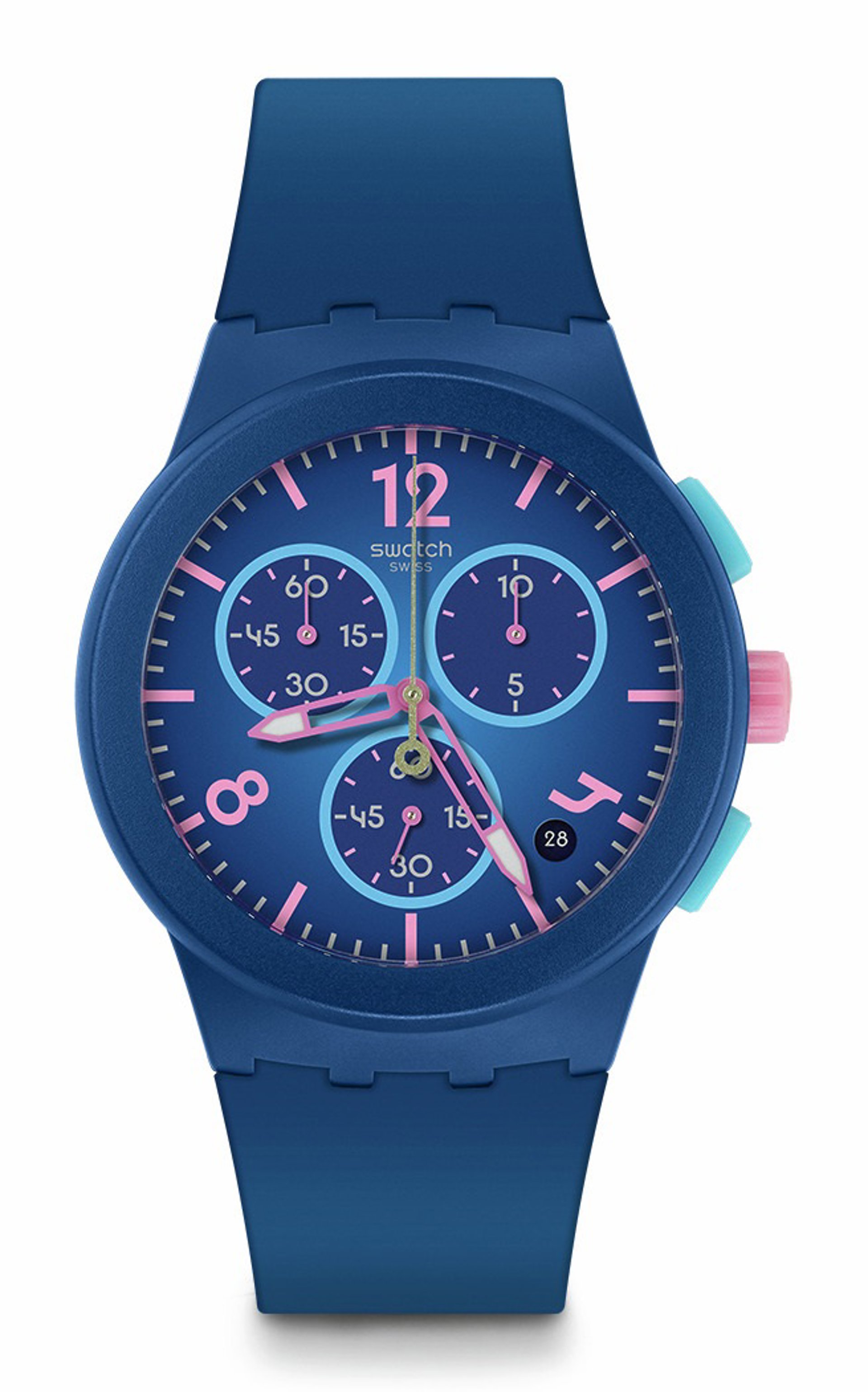 Por último, el Purple Rollshot celebra el voleibol playa y lleva el símbolo de este deporte en la trabilla. En un color lila y un rosa intenso, el modelo Swatch Gent Biosourced de 34 mm viste una muñeca más fina sin renunciar al estilo.