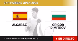 El tenista Español Carlos Alcaraz(1) se enfrenta en Treintaidosavos de final del torneo BNP Paribas Open al tenista Búlgaro Grigor Dimitrov(42) este sábado a las 23:30.