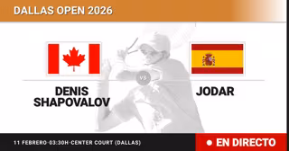 El tenista Canadiense Denis Shapovalov(40) se enfrenta en Dieciseisavos de final del torneo Dallas Open al tenista Español Rafael Jodar(124) este miércoles a las 03:30.