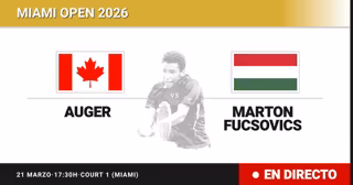 El tenista Canadiense Felix Auger-Aliassime(8) se enfrenta en Treintaidosavos de final del torneo Miami Open al tenista Húngaro Marton Fucsovics(54) este sábado a las 17:30.