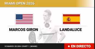El tenista Estadounidense Marcos Giron(70) se enfrenta en Sesentaicuatroavos de final del torneo Miami Open al tenista Español Martin Landaluce(151) este miércoles a las 20:30.