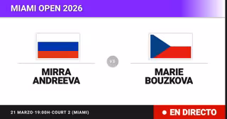 La tenista Rusa Mirra Andreeva(10) se enfrenta en Dieciseisavos de final del torneo Miami Open a la tenista Checa Marie Bouzkova(32) este sábado a las 19:00.