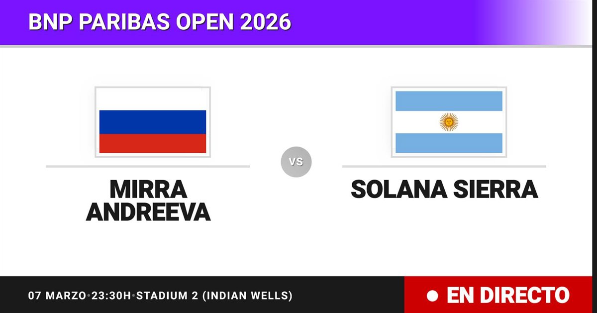 La tenista Rusa Mirra Andreeva(8) se enfrenta en Treintaidosavos de final del torneo BNP Paribas Open a la tenista Argentina - Argentina Solana Sierra(65) este sábado a las 23:30.