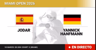 El tenista Español Rafael Jodar(109) se enfrenta en Sesentaicuatroavos de final del torneo Miami Open al tenista Alemán Yannick Hanfmann(64) este miércoles a las 20:30.