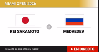 El tenista Japonés Rei Sakamoto(164) se enfrenta en Treintaidosavos de final del torneo Miami Open al tenista Ruso Daniil Medvedev(10) este sábado a las 20:00.