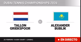 El tenista Holandés Tallon Griekspoor(25) se enfrenta en Octavos de final del torneo Dubai Tennis Championships al tenista Kazajo Alexander Bublik(10) este miércoles a las 14:00.