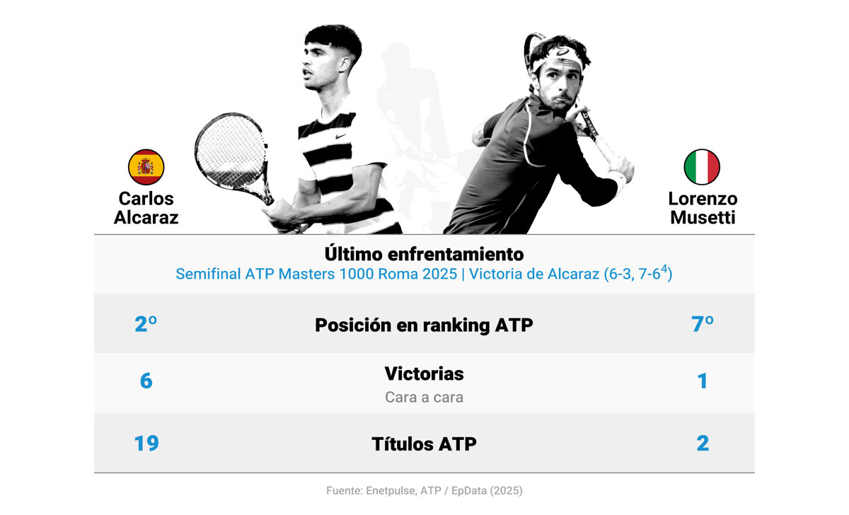 El enfrentamiento entre Alcaraz y Musetti medirá a los dos tenistas que han ganado más partidos en tierra batida en este 2025. El murciano tiene un balance de 20-1, con la única derrota en la final del Barcelona Open Banc Sabadell-Trofeo Conde de Godó ante el danés Holger Rune, y el italiano, también semifinalista en el Mutua Madrid Open, acumula un óptimo 18-3.