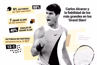 El nivel de efectividad a la hora de levantar el título de Carlos Alcaraz en los 'Grand Slam' está también a la altura de los mejores. Hasta el momento, el tenista de El Palmar ha ganado siete de los 20 'grandes' que ha jugado, lo que supone un 35 por ciento de títulos, subiendo el porcentaje al 40 si de jugar la final se trata. Unos números solo superados, en la Era Open, por el sueco Born Borg, que levantó 11 de 28 (39,3).