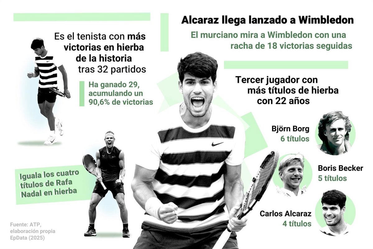Carlos Alcaraz llega en plena forma a uno de los momentos más importantes de la temporada: Wimbledon. El tercer Grand Slam de la temporada, y torneo más antiguo del mundo del tenis, arranca el próximo lunes. Una competición que en los dos últimos años ha visto campeonar al tenista murciano. Ahora, en 2025, Alcaraz buscará levantar el que sería su tercer Wimbledon seguido, el quinto sexto Grand Slam de su carrera y el quinto torneo de su carrera en hierba.