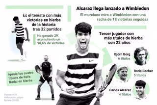 Y si se tienen en cuenta únicamente referencias en hierba, los datos de Carlos Alcaraz son aun más demoledores. Tras sus cinco victorias en Queen's --Adam Walton, Jaume Munar, Arthur Rinderknech, Roberto Bautista y Jiri Lehecka--, el murciano encadena 12 triunfos en esta superficie. Además, ha ganado cuatro de los últimos cinco torneos que ha disputado --Queen's y Wimbledon (2023), Wimbledon (2024) y Queen's (2025)-- dejando escapar sólo Queen's el año pasado.