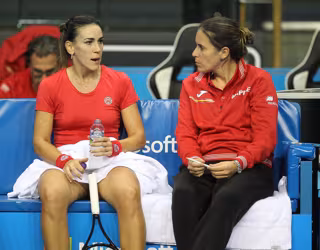 Archivo - Nuria Párrizas habla con la capitana Anabel Medina durante las Finales de la Billie Jean King Cup 2022 - ALBERTO SIMÓN/RFET - Archivo