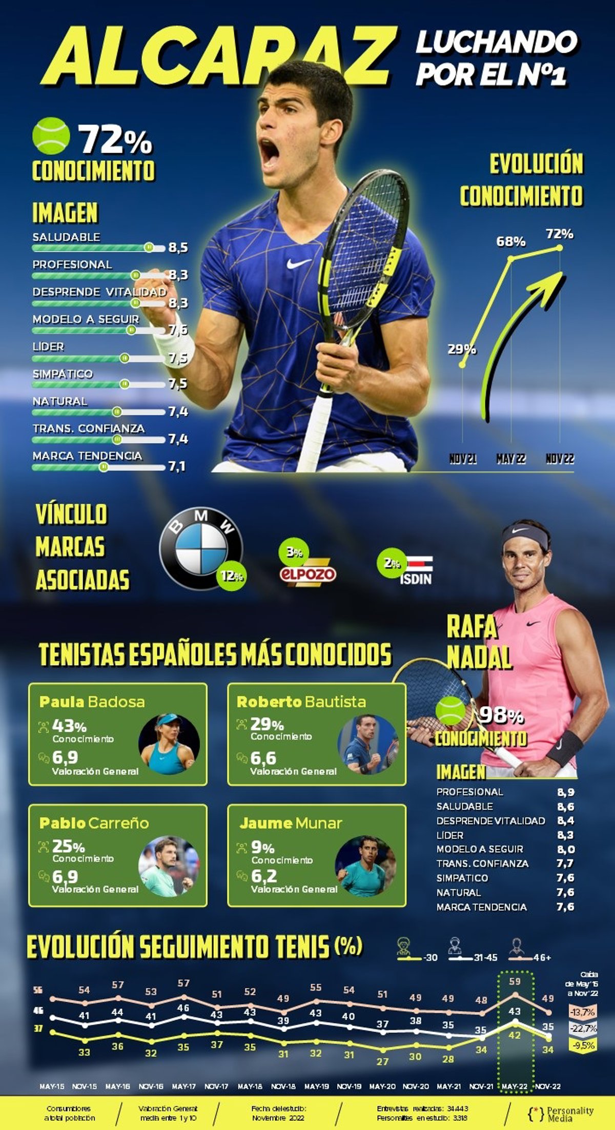 Actualmente Alcaraz es conocido por un 72% de la población, alcanzando una evolución de notoriedad donde era conocido apenas por el 29% a finales de 2021. Su imagen alcanza cifras muy destacables en su perfil de imagen, propios de un deportista de éxito: Saludable (8,5), Profesional (8,3), Desprende Vitalidad (8,3), Modelo a Seguir (7,6) y Líder (7,5).