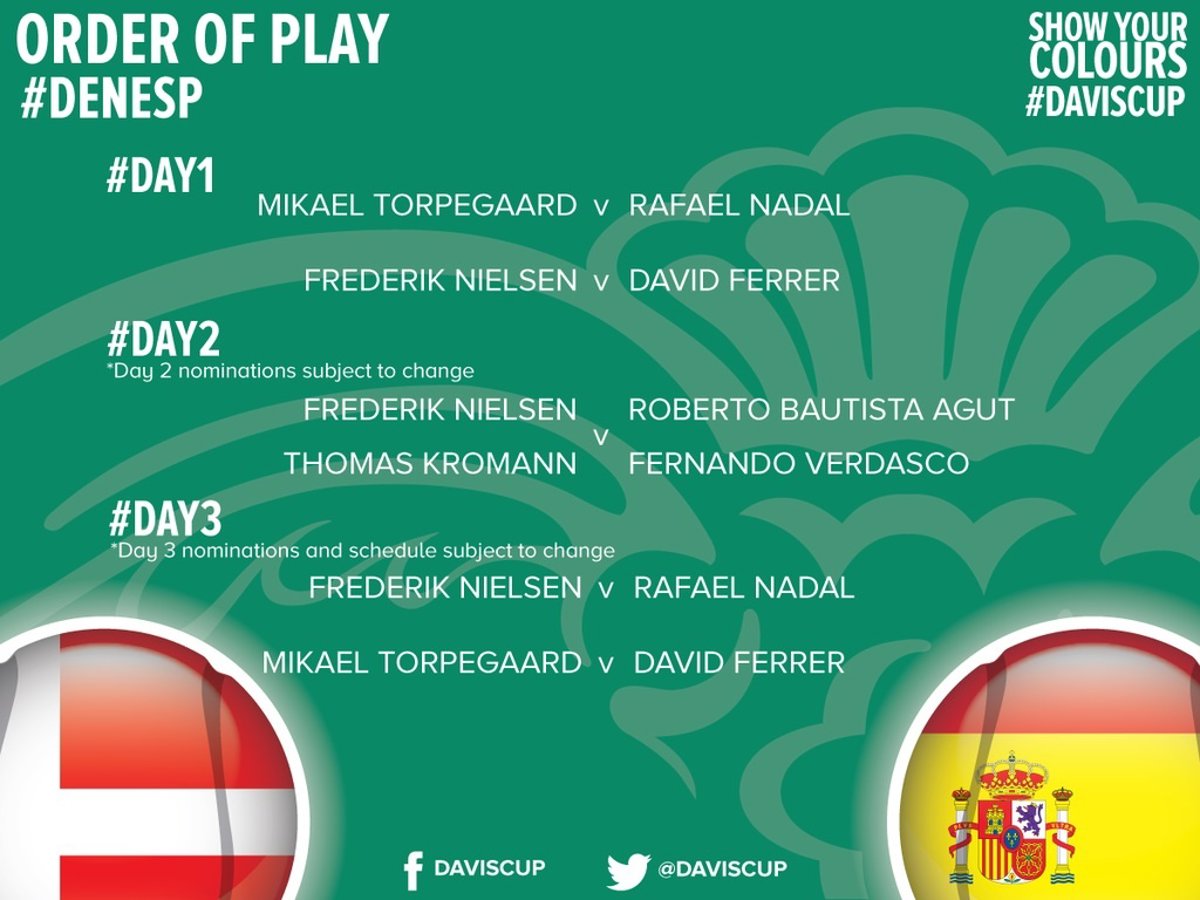 Para el sábado quedará el tradicional duelo de dobles que disputarán Frederik Nielsen y Thomas Kromann frente a Roberto Bautista Agut y Fernando Verdasco, aunque estas parejas son susceptibles de los cambios que podrían realizar los respectivos capitanes.