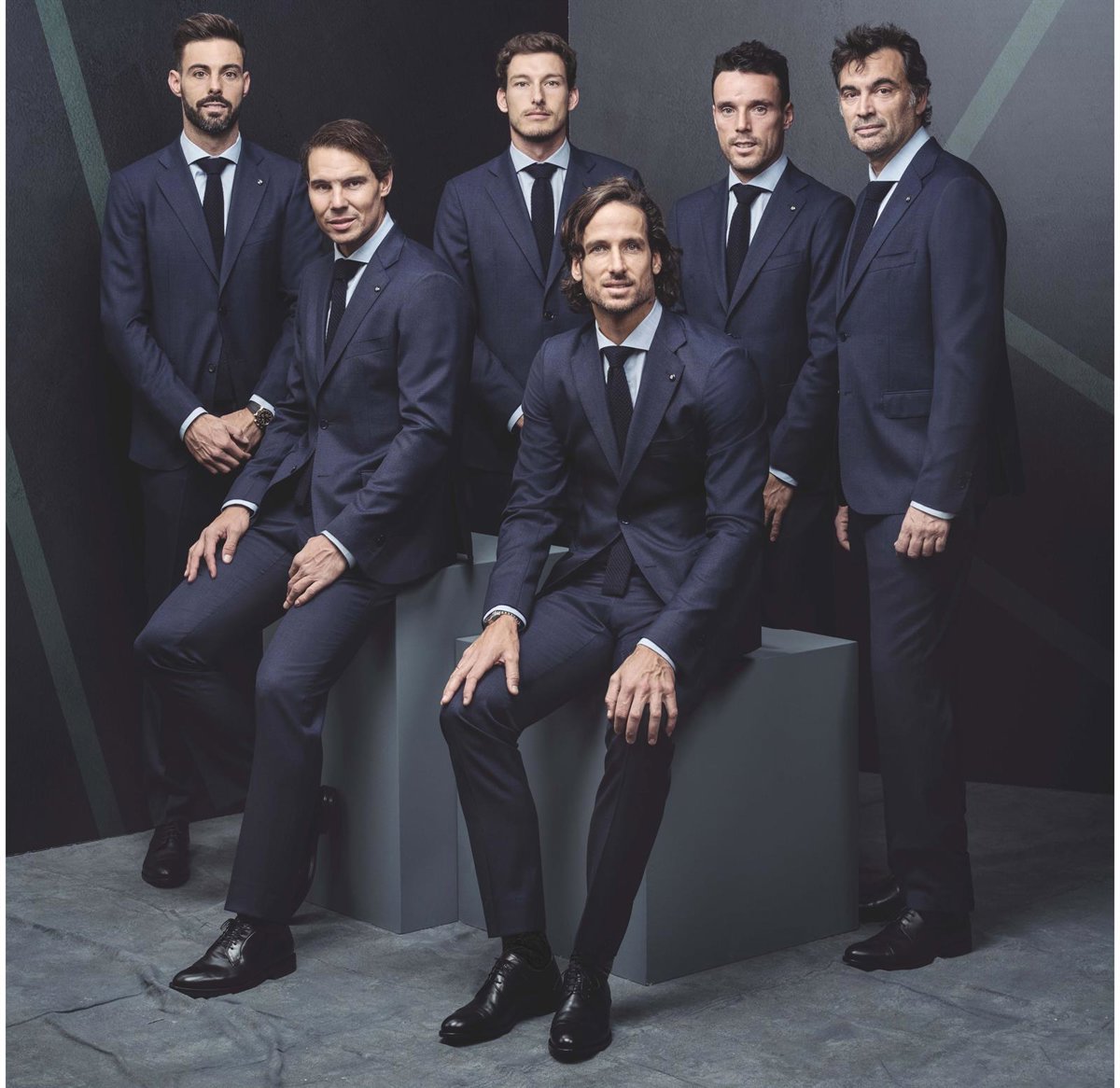 Los tenistas Feliciano López, Marcel Granollers, Pablo Carreño, Rafael Nadal y Roberto Bautista y Sergi Bruguera, capitán del equipo español, vestirán prendas de la firma Emidio Tucci de El Corte Inglés en los actos oficiales durante la nueva Copa Davis de 2019 y 2020, que se disputarán en Madrid.