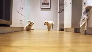 Bleu y Colby son dos preciosos Golden Retriever de lo más atolondrados a la hora de recibir la llamada de la comida. Y siempre ha sido así. Desde que eran unos cachorros de 11 semanas hasta que se convirtieron en adultos, los dos perros se dan una buena carrera por la cocina todos los días hasta que obtienen la ansiada comida.