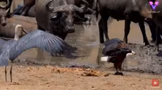 La cigüeña no está dispuesta a compartir su comida o dejar que el águila se llevara su presa y empezó a defenderse del águila, que no sólo tuvo que defenderse del ave, también de un búfalo gigante que aparece en la escena.
