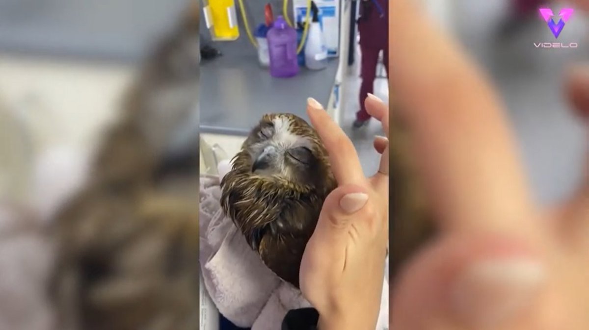 Tras ser tratado de las heridas, el búho recibió un agradable y relajante baño de agua caliente. La idea del baño fue una recomendación de un veterinario especialista en aves rapaces después de evaluar sus lesiones.
