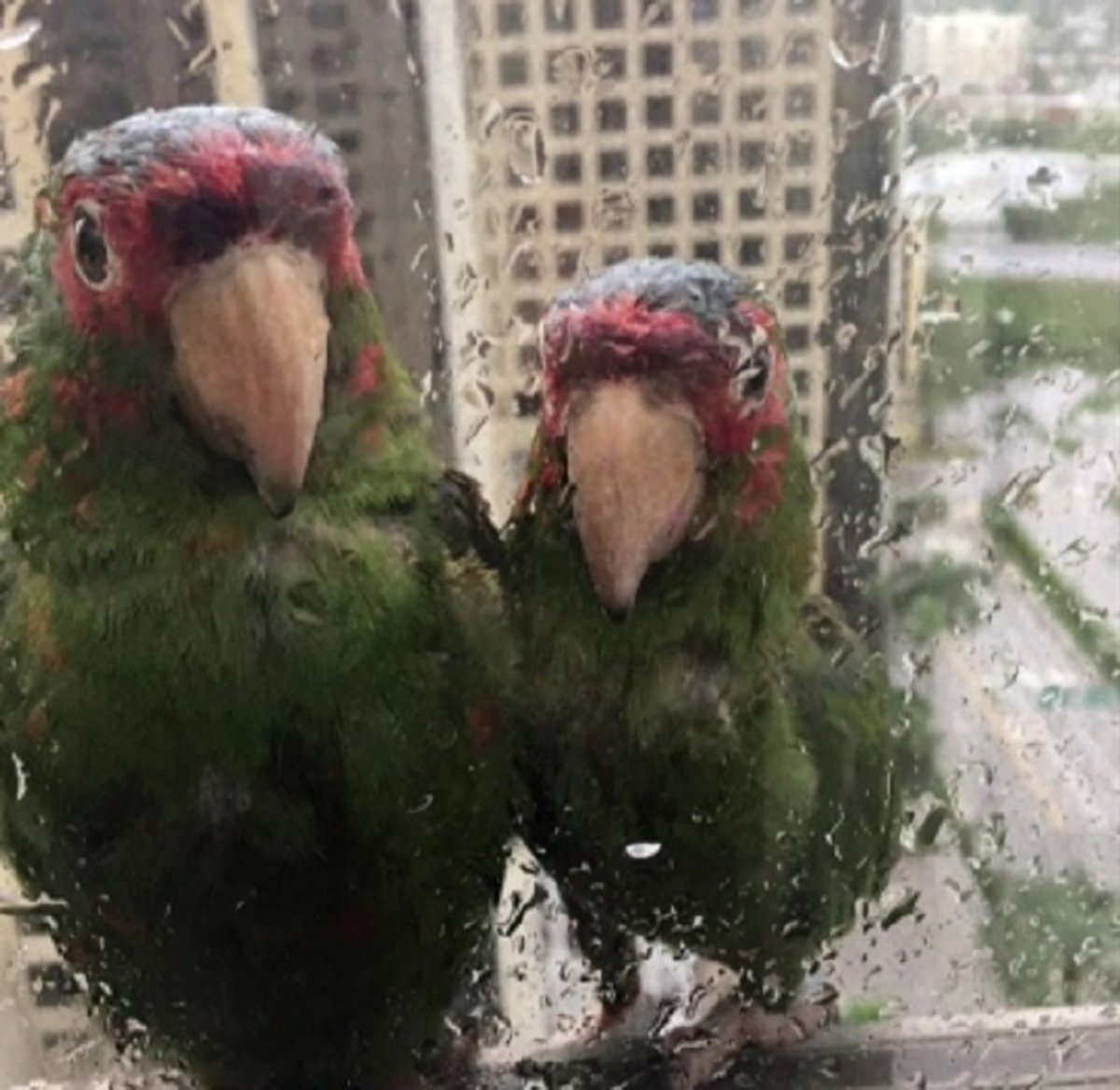 Mientras miles de personas permanecían en los refugios o en sus casas esperando la llegada del huracán Irma, dos loros buscaron cobijo al borde de una ventana en la planta 22 del hotel Dadeland Marriott, en Kendall, Florida.