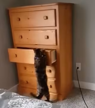 De no ser porque hay una cámara que le graba, nadie podría encontrarlo si se le busca, porque el ingenioso y mañoso gato es capaz de abrir con sus patas un cajón de una cómoda, meterse en él y cerrarlo por dentro. Así es.