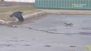 The Weather Network subió el pasado 28 de enero un curioso vídeo a Youtube: la pelea entre una ardilla y un cuervo por un trozo de pizza. Ocurrió en Greenwood, Nueva Escocia, Canadá. La pequeña ardilla tuvo la enorme fortuna de encontrar el premio gordo: una ración entera de pizza para ella sola. O eso es, al menos, lo que pretendía, porque pronto se 'unió' a la fiesta un cuervo negro, hambriento, dispuesto a luchar por llevarse la comida.