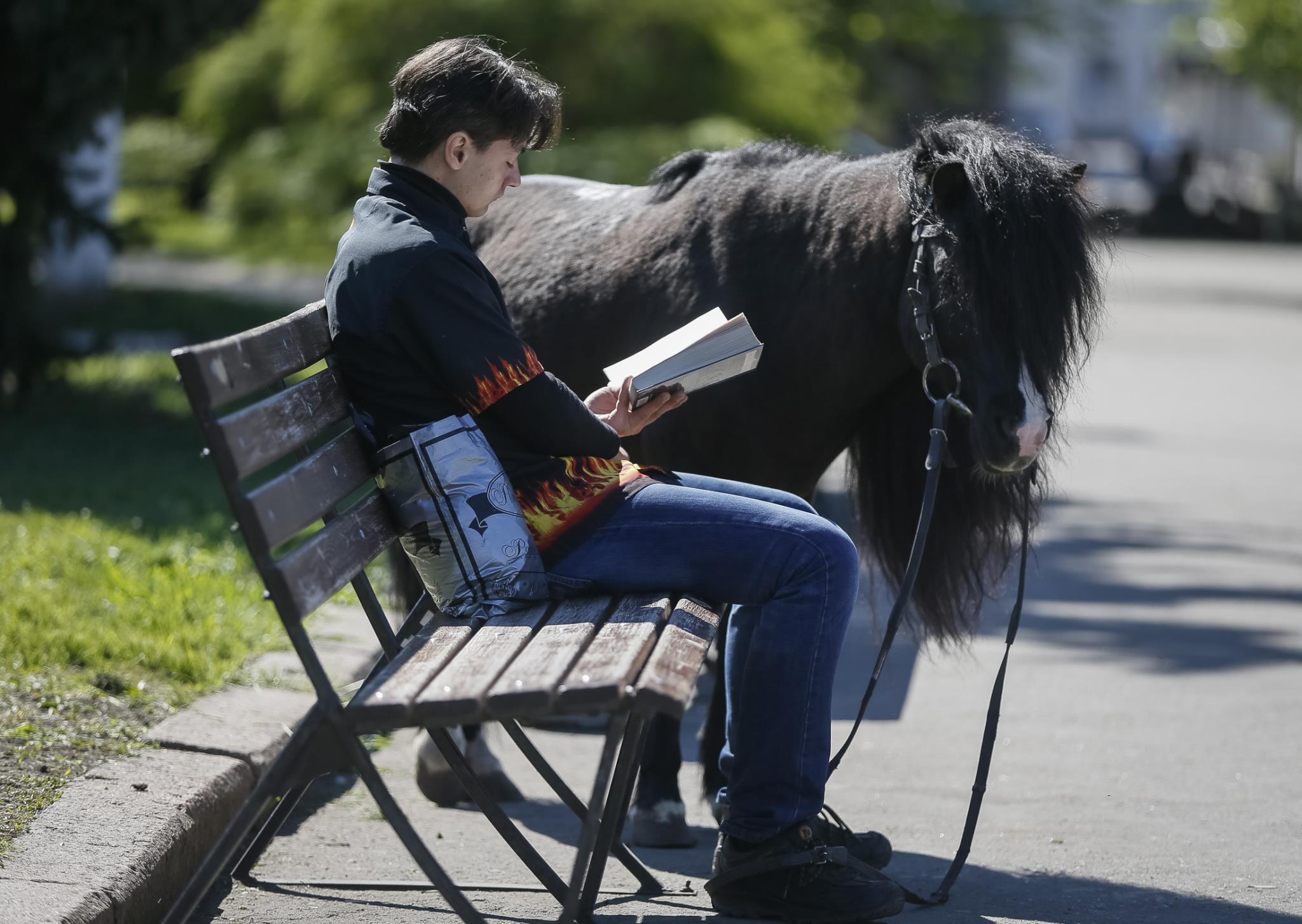 En Ucrania, este hombre lee un libro junto a su poni en un parque de la localidad de Slaviansk.