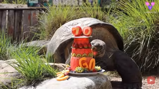 Según sus cuidadores, la fruta es un regalo especial que Hugo espera con ansias cada año. Su dieta normal se basa de zanahorias, heno, tallos de bambú, flores, así que cuando le trajeron el pastel de frutas Hugo se emocionó y fue hacia él tan rápido como pude ir una tortuga.