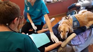 Jojo es una Golden Retriever, de 6 años, entrenada para proporcionar calma y ayudar a aliviar la ansiedad y los temores de los niños que acuden asustados a una clínica dental pediátrica en Illinois.