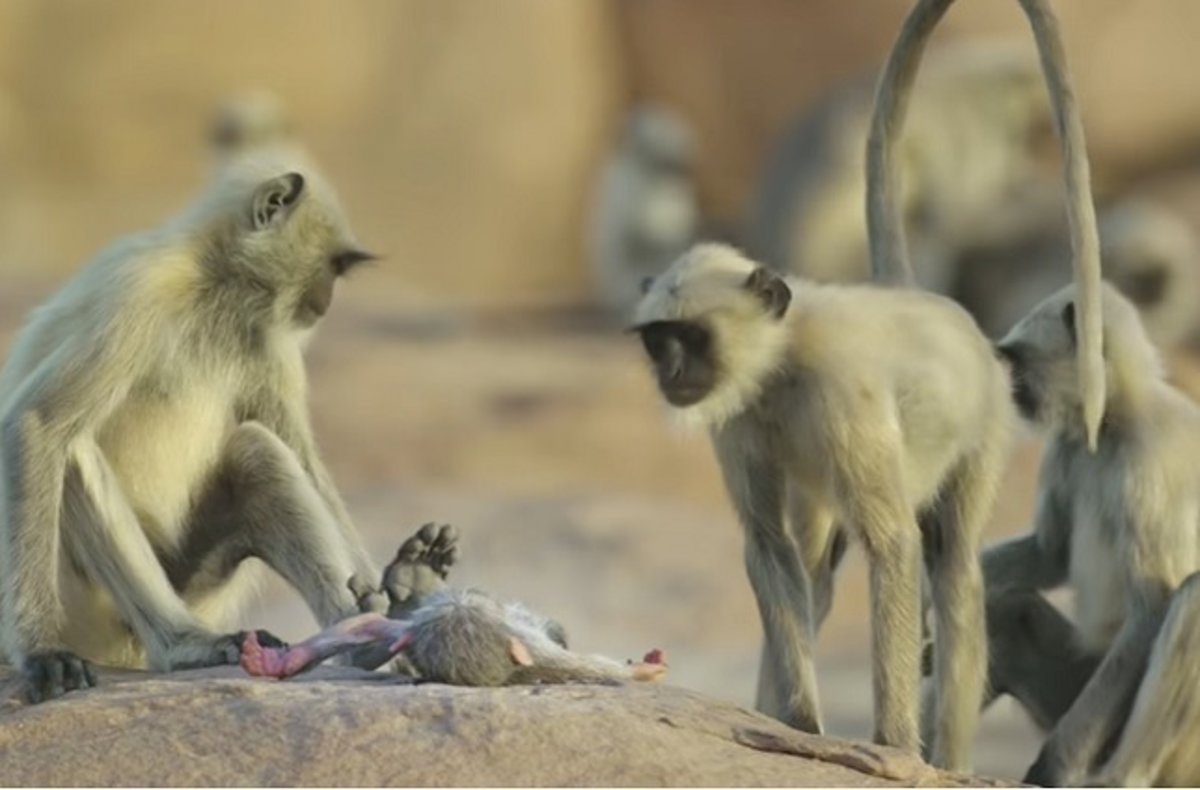 En un primer momento se puede palpar la confusión que hay en el ambiente. Acto seguido, uno de los langures recoge lo que cree es el cuerpo del bebé mono en un intento de reanimarlo, pero pronto se da cuenta de que no se mueve. Lo vuelve a dejar en el suelo y, completamente afligidos por la desgracia que acaban de presenciar, los primates empiezan a darse consuelo entre ellos y a mostrar luto ante el cadáver. Algo que se podría catalogar de verdaderamente extraordinario.
