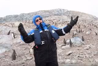 El hombre, que resulta ser el cantante británico de ópera Nick Allen y que se encontraba de excursión en la Antártida, provoca el temblor de estos animales cuando se arranca a cantar ópera justo en el momento en el que llega a una zona poblada de pingüinos.