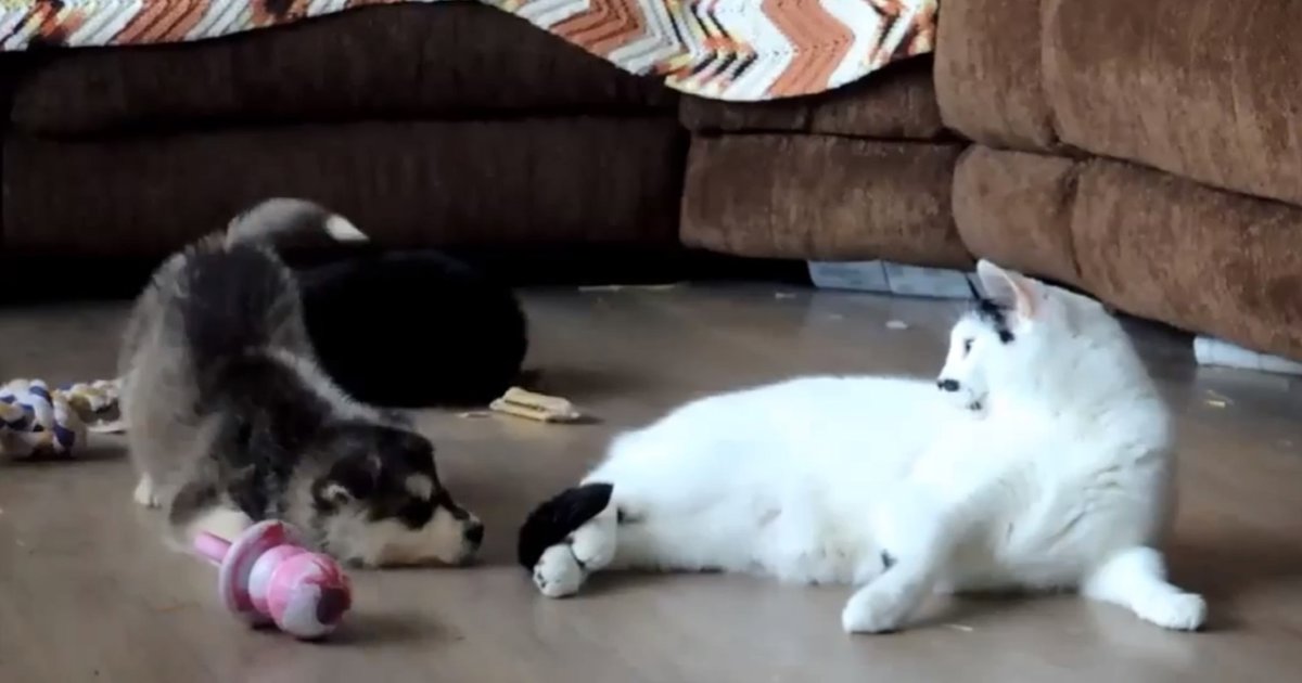 En este vídeo, un gato blanco y negro conoce a sus dos nuevos compañeros de vida: dos pequeños perros que sólo quieren jugar con su "amigo" de cuatro patas.